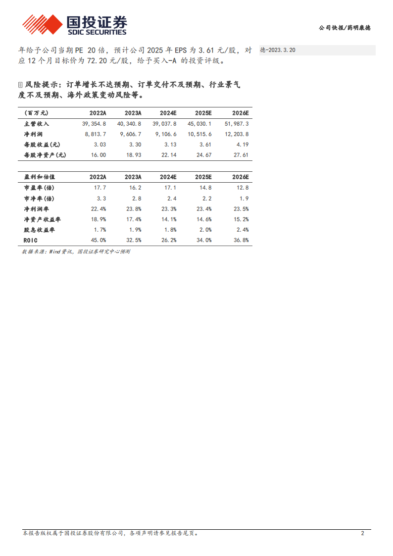 国投证券研究中心预计药明康德2024年至2026年的归母净利润分别为91.07亿元、105.16亿元和122.04亿元,分别同比增长-5.2%、15.5%和16.1%。基于2025年20倍PE估值,预计公司2025年EPS为3.61元/股,对应12个月目标价为72.20元/股。鉴于公司在手订单的持续复苏和创新业务的强劲增长潜力,研究报告维持“买入-A”的投资评级。