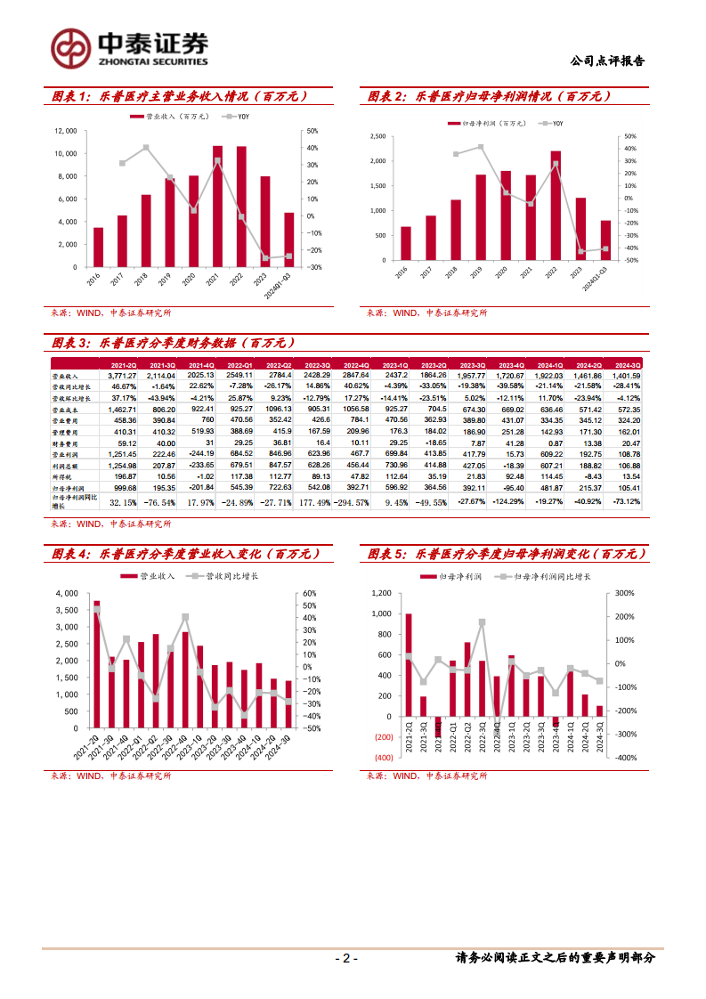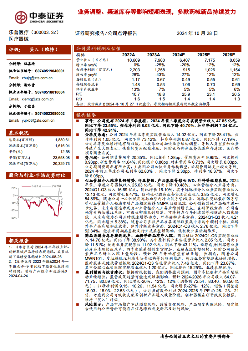基于前三季度财报数据及对未来业务调整和创新产品放量进度的评估,中泰证券对乐普医疗的盈利预测进行了调整。预计2024-2026年公司收入分别为64.07亿元、71.75亿元、80.59亿元,同比增长率分别为-20%、12%、12%(调整前预测为72.54亿元、83.40亿元、96.56亿元)。归母净利润预计分别为9.15亿元、10.26亿元、11.54亿元,同比增长率分别为-27%、12%、12%(调整前预测为16.03亿元、18.93亿元、22.53亿元)。公司当前股价对应2024-2026年PE约为26倍、23倍、21倍。考虑到公司可吸收支架等创新产品进入放量阶段,且创新器械在研管线成长性强,中泰证券维持“买入”评级。