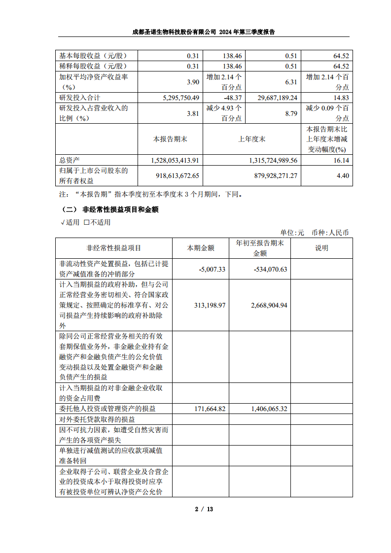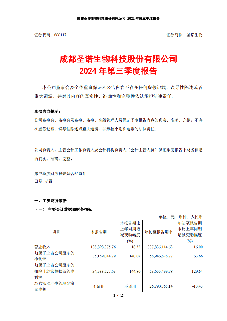 圣诺生物2024年第三季度报告