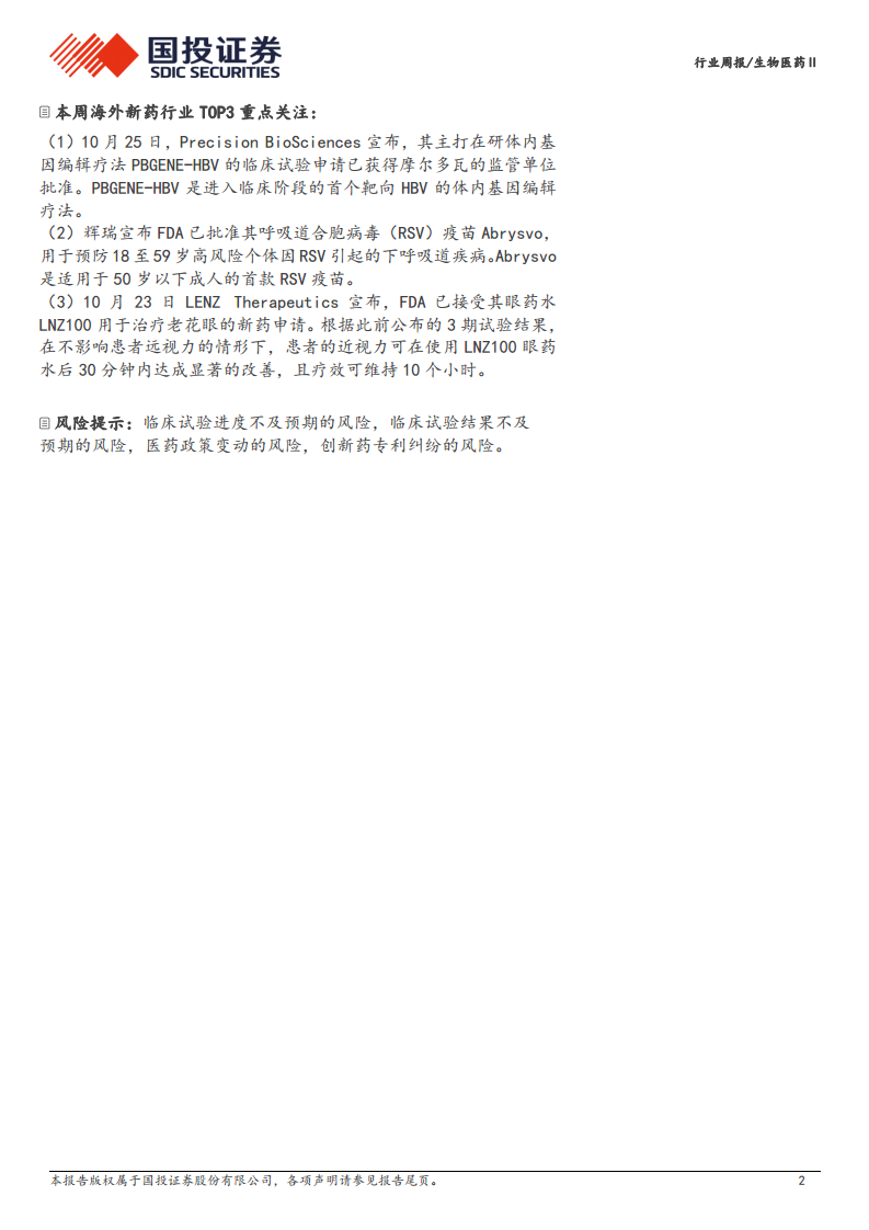 报告还强调了全球生物医药市场的动态性,通过统计数据和具体案例,展示了国内外在新药获批、临床试验进展以及商业合作方面的显著成果。这表明创新是驱动生物医药行业发展的核心动力,无论是基因编辑疗法、RSV疫苗还是老花眼治疗药物,都体现了行业在解决未满足医疗需求方面的持续努力。