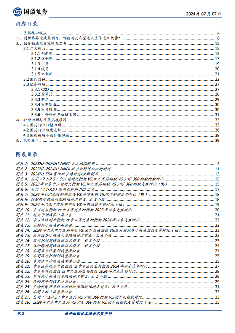 当周(7.1-7.5),申万医药指数环比上涨0.11%,在全行业中涨跌幅位列第8位,表现优于创业板指数和沪深300指数。本周专题聚焦于复盘2023年下半年至2024年上半年首次获批上市或有新适应症获批的创新药,旨在展望2024年医保谈判品种格局,为2025年创新药销售提供前瞻性分析。此外,报告还梳理了2024年上半年FDA批准的新药,以提示全球创新药物研发的前沿方向。