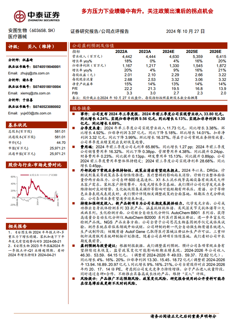 综合考虑公司在化学发光领域的持续竞争力增强、分子产品进入放量阶段,以及通过自主研发与合作不断推出高成长性产品的战略,中泰证券维持对安图生物的“买入”评级。报告同时提示了产品推广不达预期、政策变化以及研究报告使用的公开资料可能存在信息滞后或更新不及时的风险。