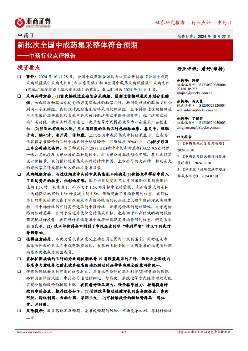 中药行业点评报告:新批次全国中成药集采整体符合预期