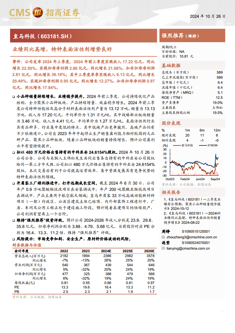 皇马科技(603181.SH)在2024年前三季度展现出强劲的业绩增长势头,实现收入17.22亿元,同比增长22.50%;归母净利润2.86亿元,同比增长21.68%;扣非归母净利润2.81亿元,同比增长36.18%。其中,第三季度单季收入和净利润也保持了稳健增长。这一增长主要得益于公司持续优化产品结构,战略性地聚焦于盈利能力更强的特种功能性及高分子材料表面活性剂(即“小品种”产品),并逐步停止生产销售盈利能力较弱的“大品种”产品。通过这一转型,公司盈利水平有望持续提升。