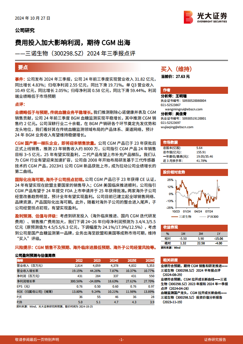 三诺生物2024年前三季度业绩受研发和销售费用投入增大的影响,归母净利润同比下滑19.71%,略低于市场预期。然而,公司传统血糖监测(BGM)业务保持平稳增长,而连续血糖监测(CGM)业务作为新的增长引擎,在国内市场加速放量,并已获得CE认证,有望在2024年进入欧盟市场,2025年获批进入美国市场,国际化前景广阔。此外,海外子公司经营状况改善,预计将实现盈利。尽管短期利润预测有所下调,但基于公司在血糖监测领域的龙头地位和CGM业务的长期增长潜力,分析师维持“买入”评级。