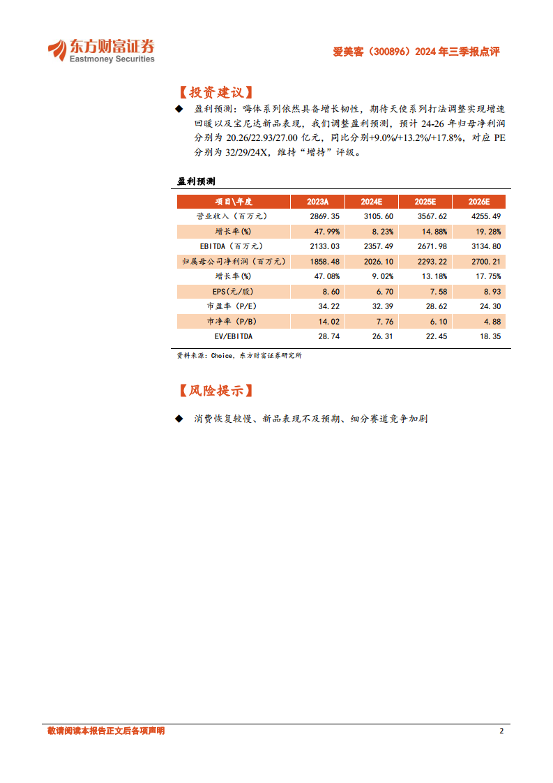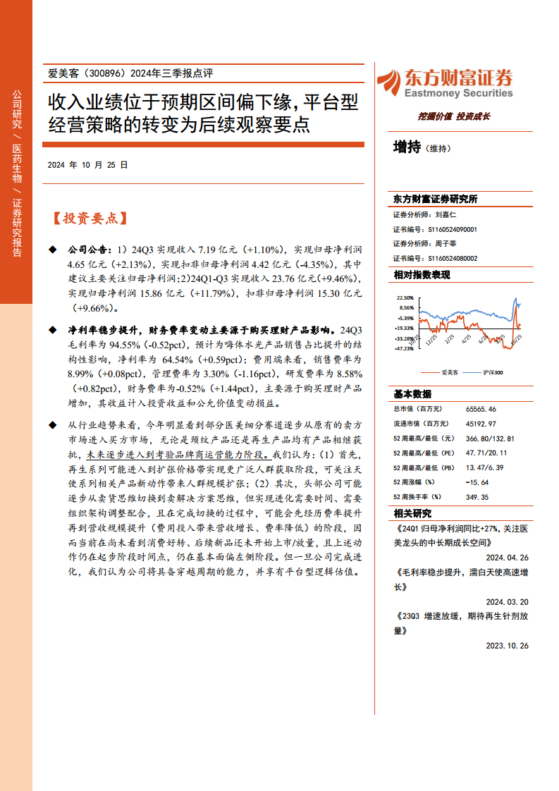 爱美客在2024年第三季度及前三季度展现出稳健的财务表现,收入和归母净利润均实现增长,净利率持续提升。面对医美行业从卖方市场向买方市场的转变,公司正积极调整经营策略,从“卖货思维”向“卖解决方案思维”转型,并致力于通过再生系列产品的价格带扩张和组织架构调整,以期在未来实现平台型逻辑估值并具备穿越周期的能力。尽管当前处于战略转型的初期阶段,面临消费恢复速度、新品表现及市场竞争加剧等风险,但公司嗨体系列仍具增长韧性,且对天使系列和宝尼达新品寄予厚望。东方财富证券维持其“增持”评级,并对其未来盈利能力持积极预期。