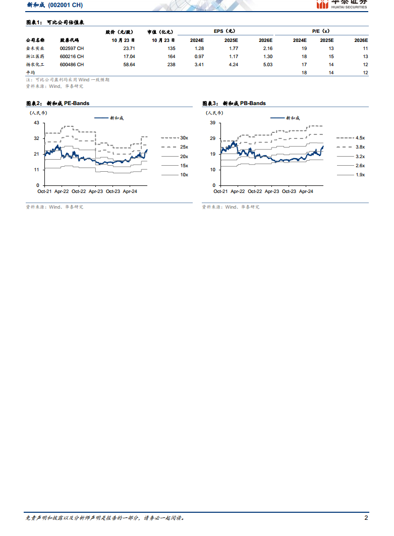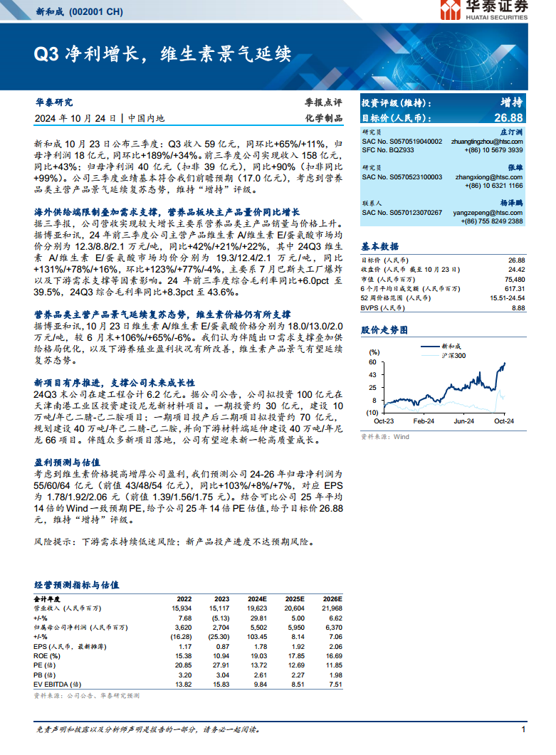 考虑到维生素价格提高增厚公司盈利,华泰研究上调了公司2024-2026年归母净利润预测至55/60/64亿元(前值为43/48/54亿元),同比增速分别为103%/8%/7%。对应EPS分别为1.78/1.92/2.06元(前值为1.39/1.56/1.75元)。结合可比公司2025年平均14倍的Wind一致预期PE,给予公司2025年14倍PE估值,目标价26.88元,维持“增持”评级。 风险提示包括:下游需求持续低迷风险;新产品投产进度不达预期风险。