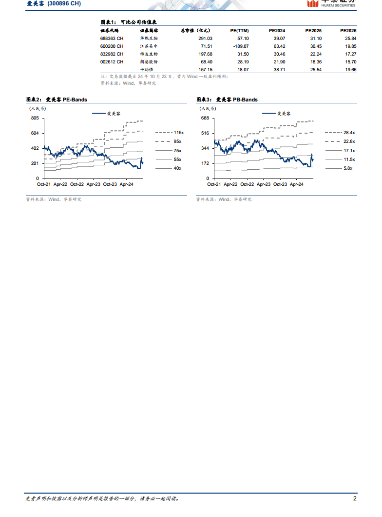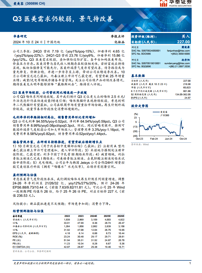 基于医美景气度阶段性承压的考量,华泰研究对爱美客的盈利预测进行了调整。将2024-2026年的净利润分别调整至21亿、26亿和32亿元人民币,同比增长12%、27%和20%(前值为24-26年净利润23/30/36亿元)。相应的,2024-2026年每股收益(EPS)预计为6.88元、8.73元和10.44元(前值为7.63/9.82/11.81元)。根据可比公司2025年Wind一致预期PE均值26倍,给予爱美客2025年26倍PE,对应目标价调整为227元人民币(前值为236.53元)。研究报告维持“买入”投资评级。
