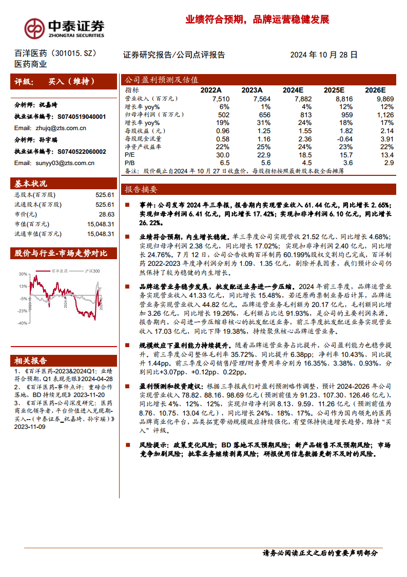 根据三季报数据,分析师对公司盈利预测进行了调整。预计2024-2026年公司将实现营业收入78.82亿元、88.16亿元和98.69亿元,分别同比增长4%、12%和12%。同期,归母净利润预计将达到8.13亿元、9.59亿元和11.26亿元,分别同比增长24%、18%和17%。鉴于公司作为国内领先的医药品牌商业化平台,其品类拓宽策略有望持续强化规模效应,并保持快速增长趋势,因此维持“买入”评级。