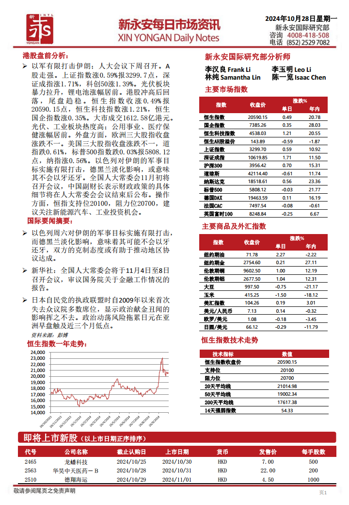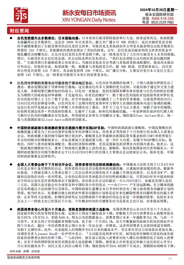 本报告对2024年10月28日的港股盘前市场进行了专业而深入的分析。全球市场在多重因素交织下呈现复杂态势:A股表现强劲,港股震荡趋稳;地缘政治方面,以色列对伊朗的有限打击以及德黑兰的克制态度,为地区局势带来一丝缓和迹象;宏观经济方面,中国财政刺激政策的细节即将公布,有望提振内需,而美国消费者信心指数升至六个月高点,显示经济韧性。然而,日本政治动荡和部分公司业绩波动也增加了市场的不确定性。投资者应密切关注即将公布的宏观经济数据和政策落地情况,并可重点关注新能源汽车和工业等具有结构性增长潜力的板块。