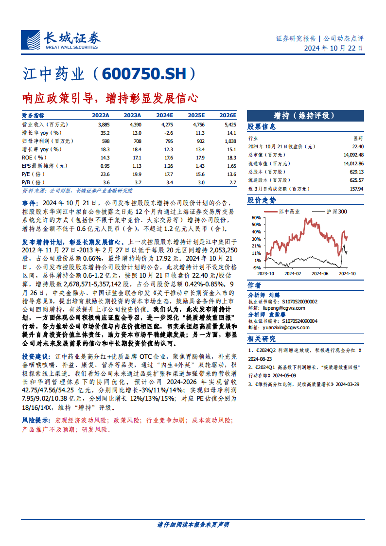 本报告核心观点在于,江中药业控股股东华润江中宣布增持公司股份,此举不仅积极响应了监管机构关于推动中长期资金入市的政策引导,更强烈释放了控股股东对公司未来发展前景的坚定信心以及对其中长期投资价值的高度认可。
