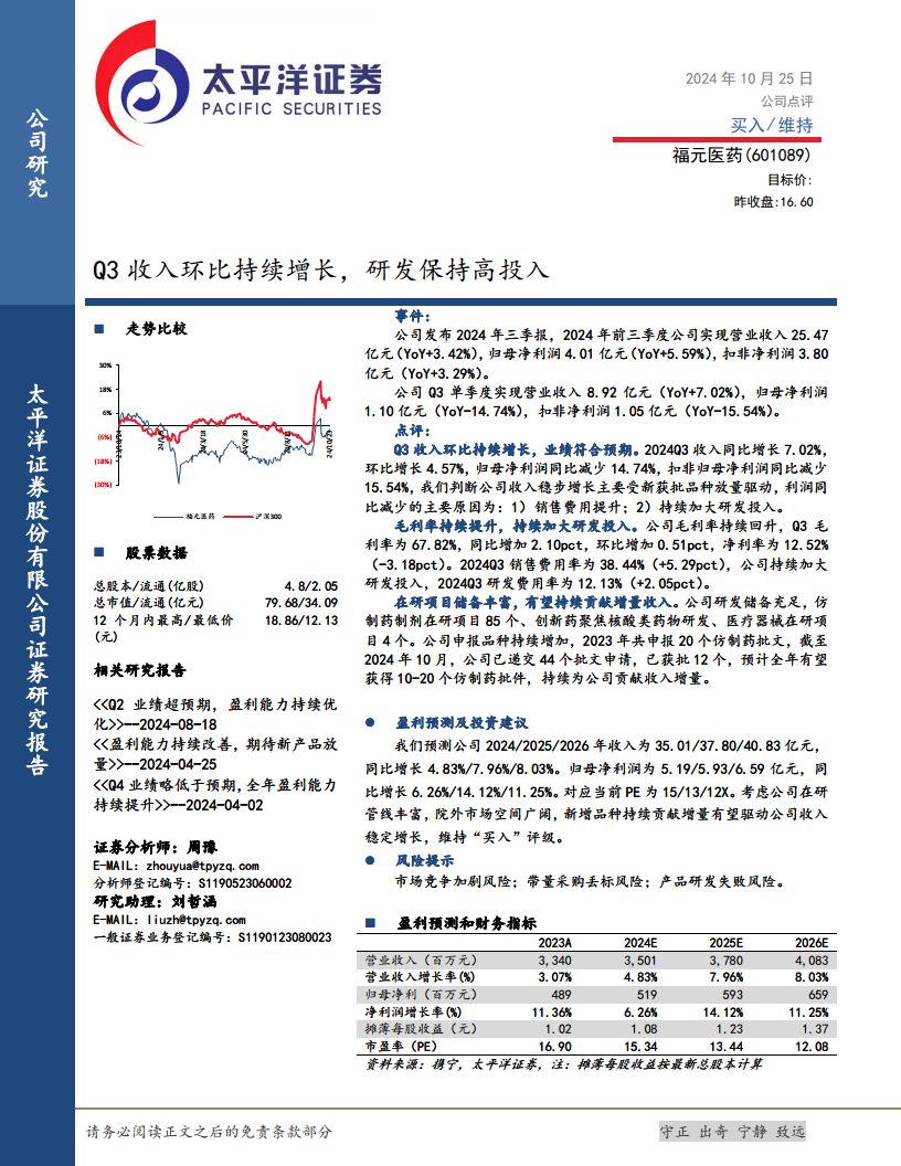 福元医药在2024年前三季度实现了营业收入的稳健增长,尤其Q3收入表现亮眼,但同期净利润因销售和研发投入的增加而短期承压。公司持续优化毛利率,并战略性地加大研发投入和市场推广力度,以期构建长期增长动力。其丰富的在研管线和持续获批的新品种是未来收入增长的关键驱动力。太平洋证券基于对公司未来收入和利润的积极预测,维持“买入”评级,同时提示了市场竞争、带量采购和研发失败等潜在风险。