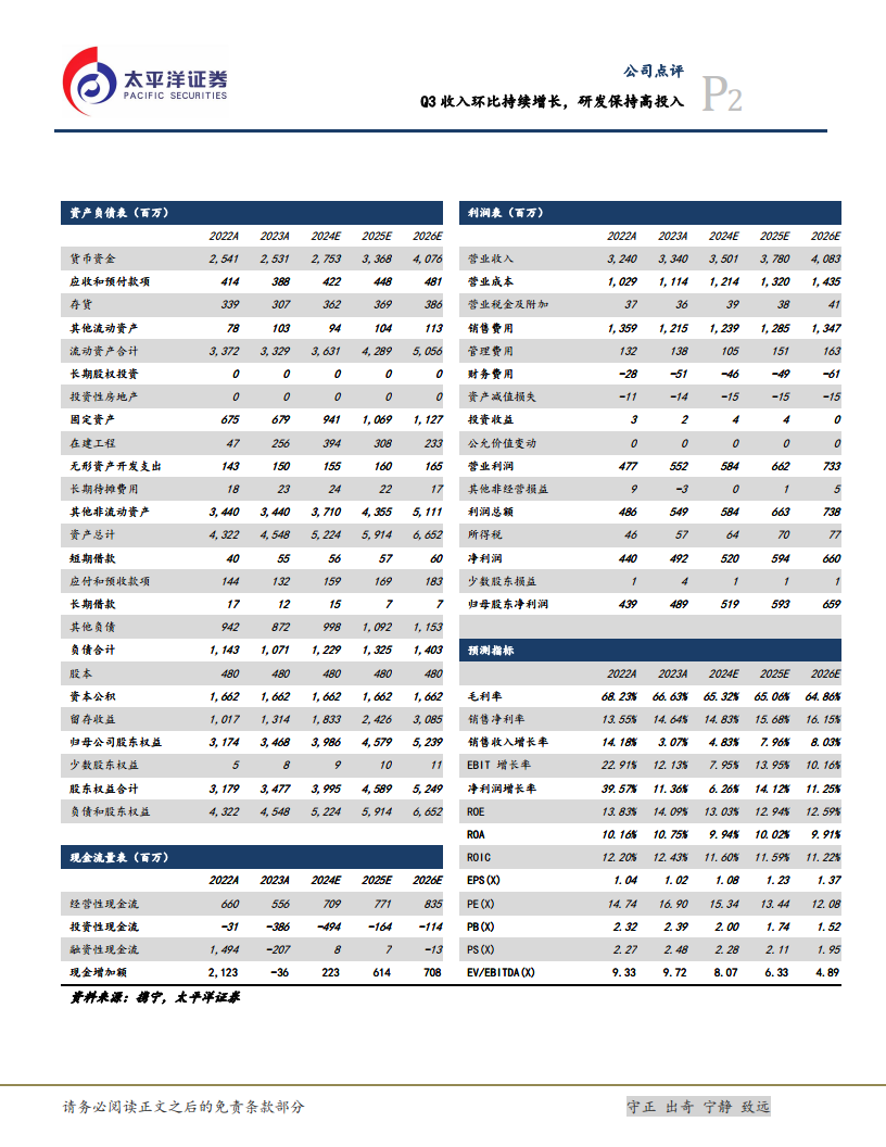 2024年Q3单季度,公司实现营业收入8.92亿元,同比增长7.02%,环比增长4.57%,显示出收入持续增长的良好势头。然而,Q3归母净利润为1.10亿元,同比下降14.74%;扣非净利润1.05亿元,同比下降15.54%。研究报告分析,利润同比减少的主要原因在于销售费用提升和持续加大研发投入。