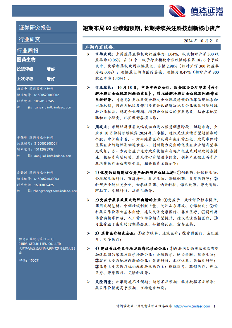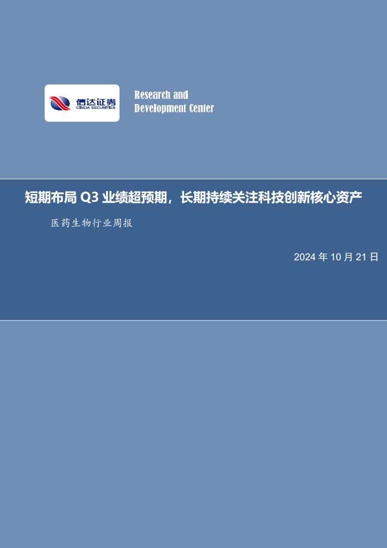 本报告核心观点指出,在市场经历大幅波动后进入震荡调整阶段,医药生物行业短期内应重点关注2024年第三季度业绩有望超预期的个股。从中长期来看,随着医疗反腐和集采政策的常态化,其对医药企业的影响边际减弱,具备卓越创新能力的优质企业有望率先实现业绩复苏。同时,受益于地方政府化债和房地产托底等财政刺激措施,投融资环境有望回暖,居民消费信心逐步修复,这将利好创新产业链上游资产及消费医疗企业。