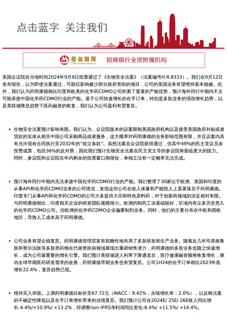 药明康德管理层富有前瞻性地布局了多肽研发和生产业务。随着近年来司美格鲁肽和替尔泊肽等多肽类药物在代谢类疾病领域展现出重磅销售潜力,公司的多肽业务也随之实现快速增长,已成为公司最重要的增长引擎。本报告预计,随着美联储进入利率下降通道,全球医疗健康领域的融资额将恢复增长,这将有效驱动全球早期医药研发需求的改善,从而带动药明康德早期业务的复苏。公司2024年上半年在手订单相比2023年底增长了22.4%,这一数据明确显示了业务的积极复苏趋势。基于法案不确定性降低和在手订单增长带来的业绩复苏预期,招银国际维持药明康德“买入”评级,并将目标价上调至67.72元(WACC:9.42%,永续增长率:2.0%)。财务预测显示,公司2024年、2025年和2026年收入同比增速预计分别为-4.4%、+10.9%和+13.2%;经调整non-IFRS净利润同比变化预计分别为-8.4%、+11.5%和+14.4%,预示着未来盈利能力的逐步改善和增长。