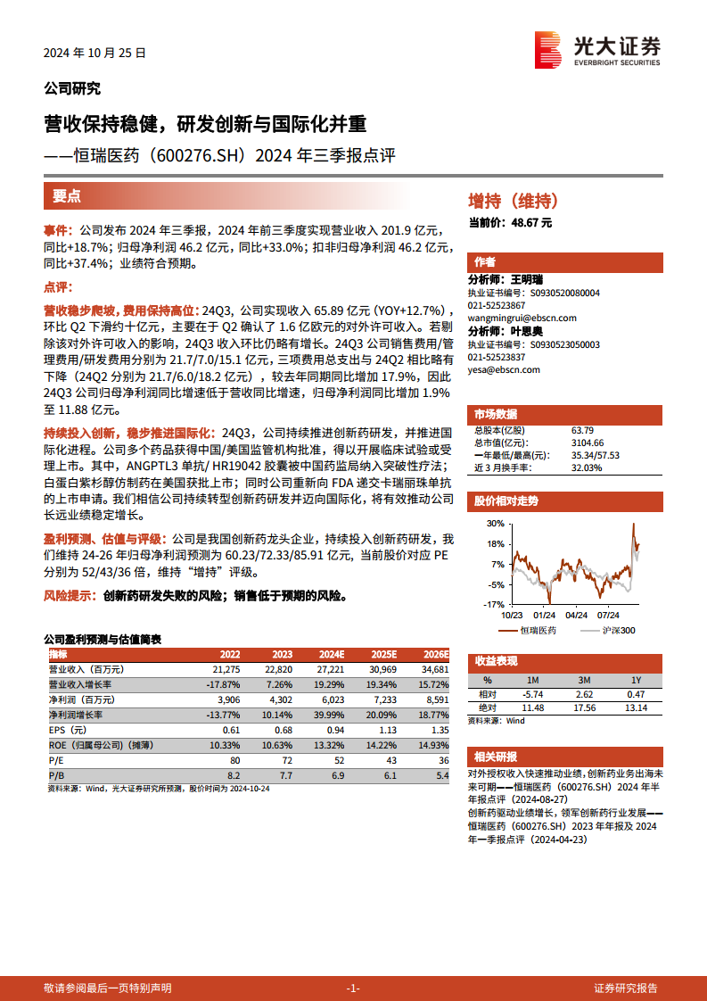 恒瑞医药在2024年前三季度展现出稳健的财务增长,营业收入和归母净利润均实现显著提升,符合市场预期。公司持续将研发创新作为核心战略,通过多个创新药的研发进展和国内外监管机构的批准,巩固了其在创新药领域的领先地位。同时,公司积极推进国际化战略,白蛋白紫杉醇仿制药在美国获批上市以及卡瑞丽珠单抗重新递交FDA上市申请,均体现了其拓展全球市场的决心。尽管面临研发失败和销售不及预期的风险,但分析师维持“增持”评级,并对公司未来三年的盈利能力持乐观态度,认为其作为创新药龙头企业,有望通过持续创新和国际化布局实现长期稳定的业绩增长。