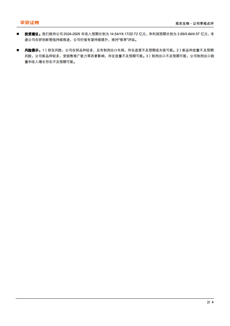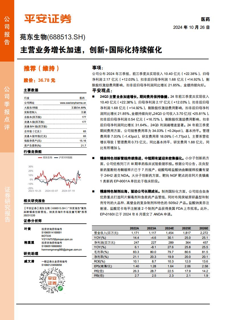 基于公司在研创新管线的持续推进以及国际化战略的积极进展,平安证券维持对苑东生物的“推荐”评级。