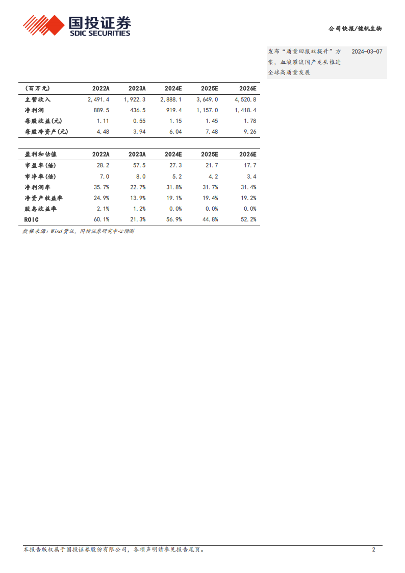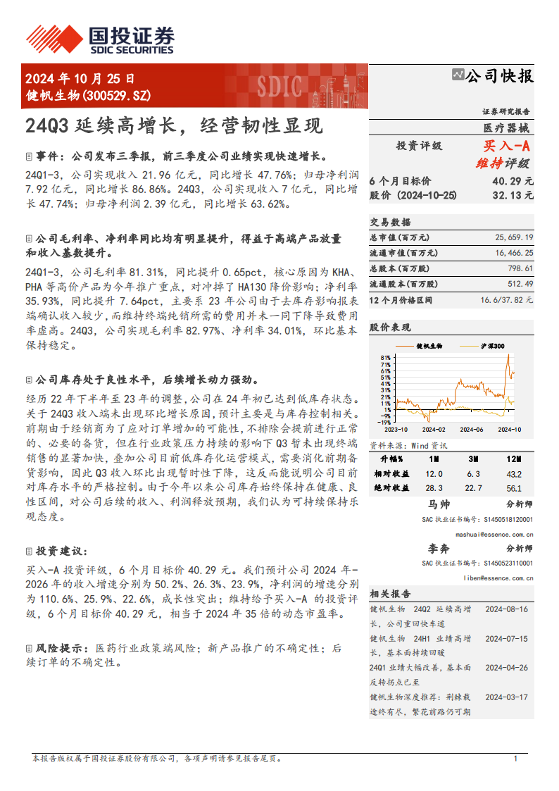 健帆生物在2024年前三季度表现出强劲的业绩增长和显著的盈利能力提升,这得益于其高端产品的放量和有效的费用控制。公司通过健康的库存管理策略,展现了良好的经营韧性,为未来的持续增长奠定了基础。分析师维持“买入-A”评级,并预测公司未来几年将保持高速增长,但同时提示了行业政策、新产品推广和订单等方面的潜在风险。整体来看,健帆生物展现出良好的投资价值和成长潜力。