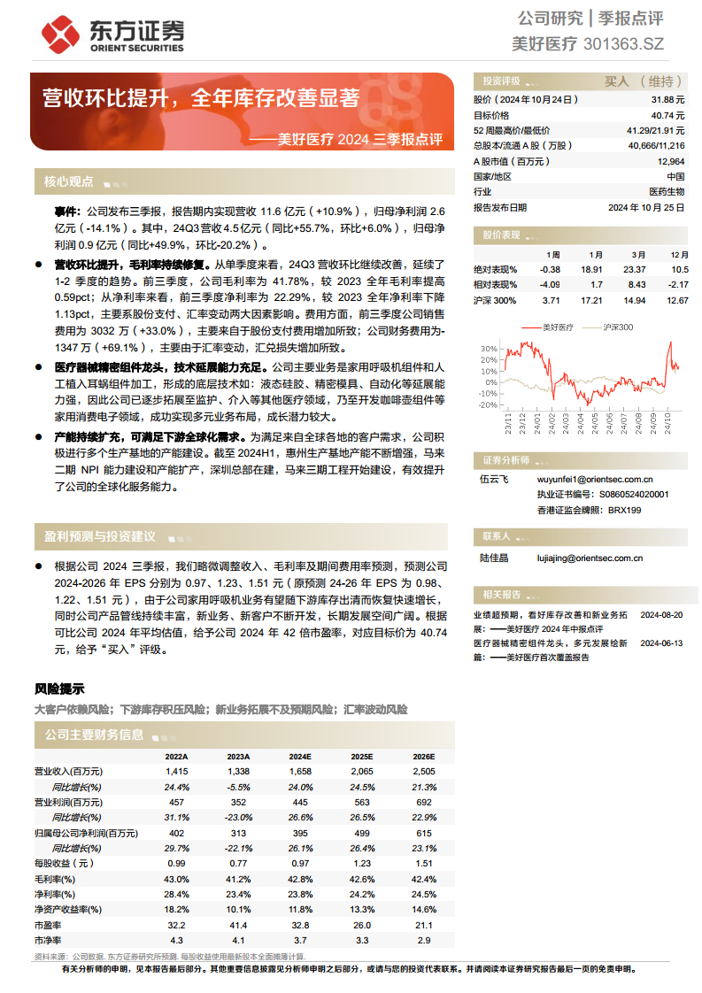 美好医疗(301363):2024三季报点评:营收环比提升,全年库存改善显著