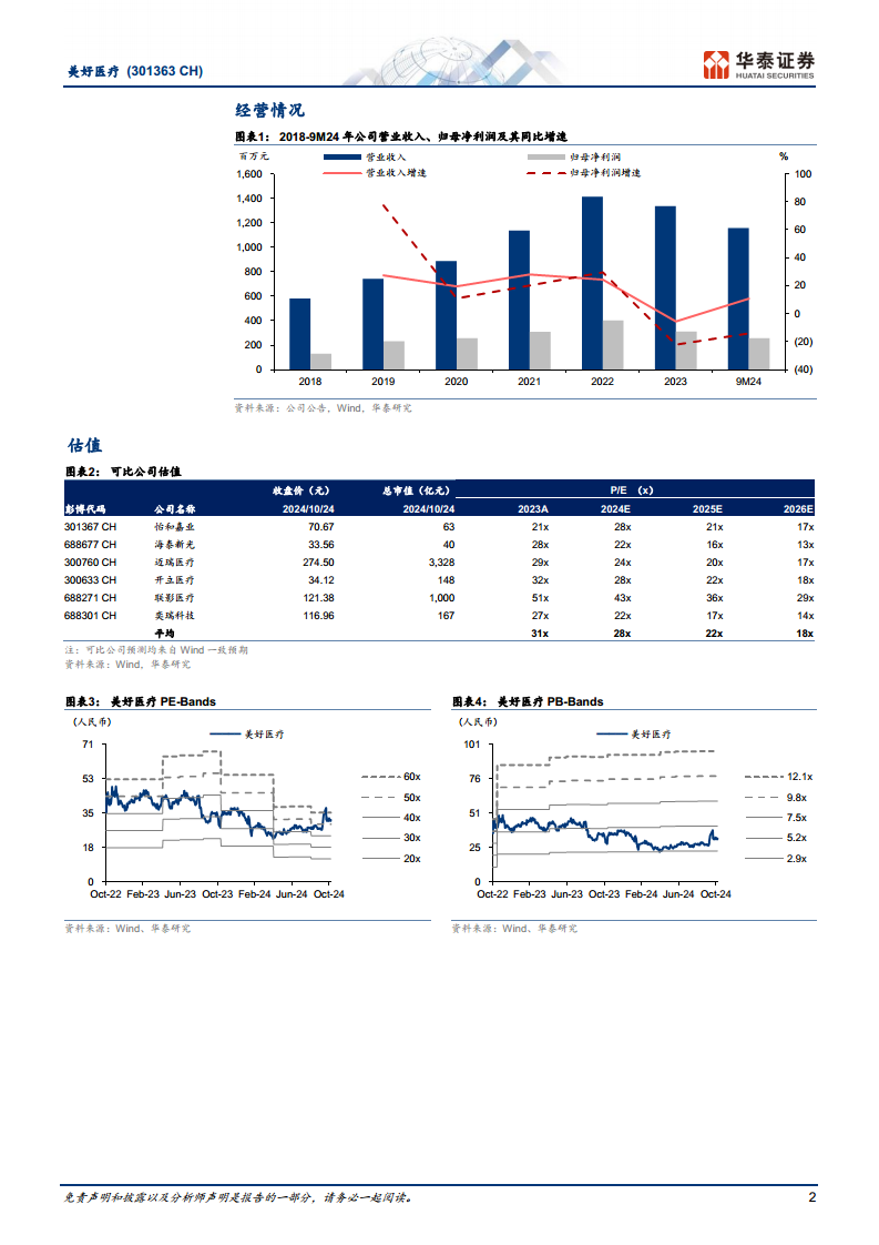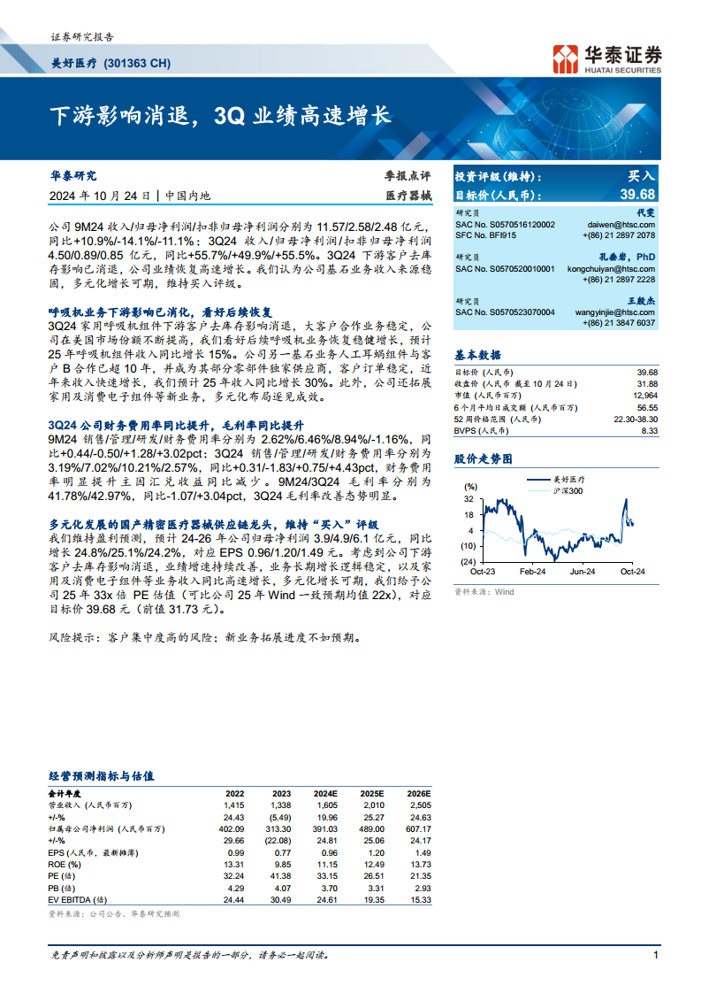 华泰研究基于美好医疗下游客户去库存影响的消退、业绩增速的持续改善、业务长期增长逻辑的稳定以及多元化业务的良好发展,维持其“买入”投资评级,并将目标价上调至39.68元人民币。报告预计公司2024-2026年归母净利润将保持约24-25%的年复合增长率,对应EPS分别为0.96/1.20/1.49元。