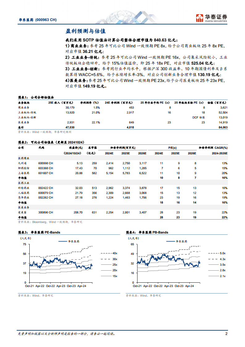 华泰研究对华东医药的盈利能力进行了预测,并采用SOTP估值法确定了目标价。