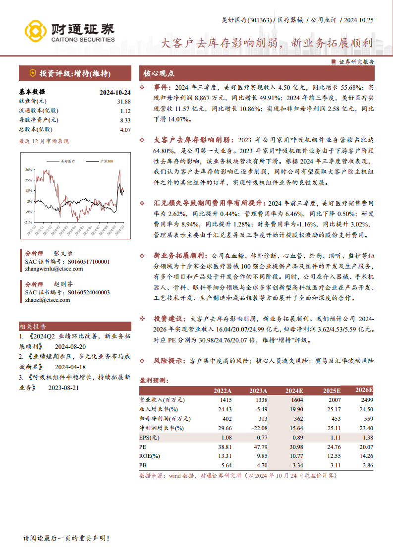 美好医疗在2024年第三季度实现了强劲的业绩反弹,营收和归母净利润均大幅增长,显示出其核心家用呼吸机组件业务已走出大客户去库存的低谷。尽管前三季度扣非归母净利润受汇兑损失和股权激励费用影响有所下滑,但公司在多个医疗器械细分领域的新业务拓展进展顺利,与全球领先企业建立了广泛合作,为未来的多元化增长奠定了基础。分析师维持“增持”评级,并预测公司未来三年营收和净利润将持续增长,反映了市场对其业务恢复和新增长点潜力的积极预期。同时,报告也提示了客户集中度、核心人员流失以及贸易汇率波动等潜在风险。