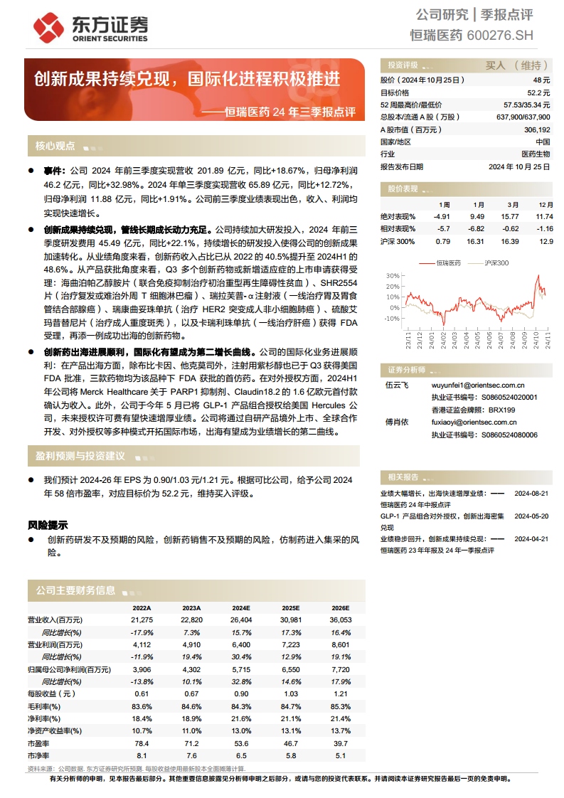 恒瑞医药在2024年前三季度表现出强劲的增长势头,营收和归母净利润均实现显著增长。这主要得益于公司持续的研发投入和创新成果的加速转化,创新药已成为公司业绩增长的核心驱动力。同时,公司在国际化进程中取得突破性进展,多款产品获得海外市场批准或授权,对外授权业务也为业绩带来增量贡献,国际化有望成为公司未来业绩的“第二增长曲线”。尽管面临创新药研发和销售不及预期、仿制药集采等风险,但基于其强大的创新能力和积极的国际化战略,公司未来成长动力充足,盈利能力有望持续提升。分析师维持“买入”评级,并给出52.2元的目标价。