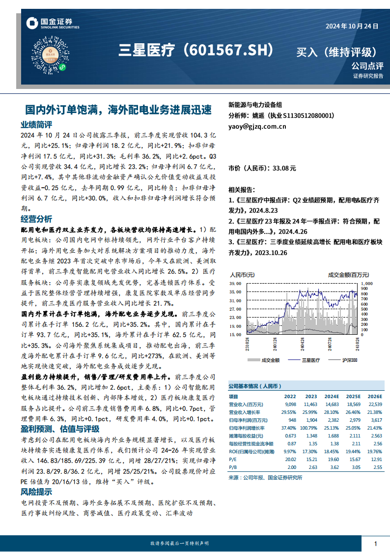 本报告全面分析了公司2024年前三季度的业绩表现及经营状况。公司前三季度营收和扣非归母净利润均实现稳健增长,毛利率显著提升,显示出良好的盈利能力。这主要得益于智能配用电和医疗服务两大核心业务的协同发展,尤其是在手订单的充裕,特别是海外配电业务的快速突破,为公司未来业绩增长奠定了坚实基础。尽管面临电网投资、海外拓展、医疗政策等多方面风险,但鉴于公司强劲的增长势头和持续优化的盈利结构,研究机构对其未来发展持乐观态度,并维持“买入”评级。