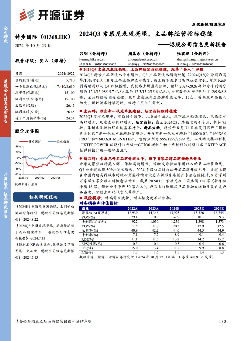 特步国际在2024年第三季度展现出稳健的经营态势,主品牌通过持续的产品创新(如新一代冠军版跑鞋系列)和精细化的运营管理(如稳定的库销比和折扣水平)保持了市场竞争力。与此同时,新品牌索康尼作为集团的第二增长曲线,通过聚焦精英人群、开启品牌升级元年、积极拓展高线城市渠道(如深圳万象城概念店开业)以及加大营销和产品投入,实现了超过50%的流水高速增长。公司整体盈利能力持续增强,分析师上调了未来三年的归母净利润预测,并维持“买入”评级,反映了市场对其未来增长潜力的认可。尽管面临终端需求和新品接受度的潜在风险,特步国际凭借其多品牌战略和稳健的财务表现,展现出积极的发展前景。