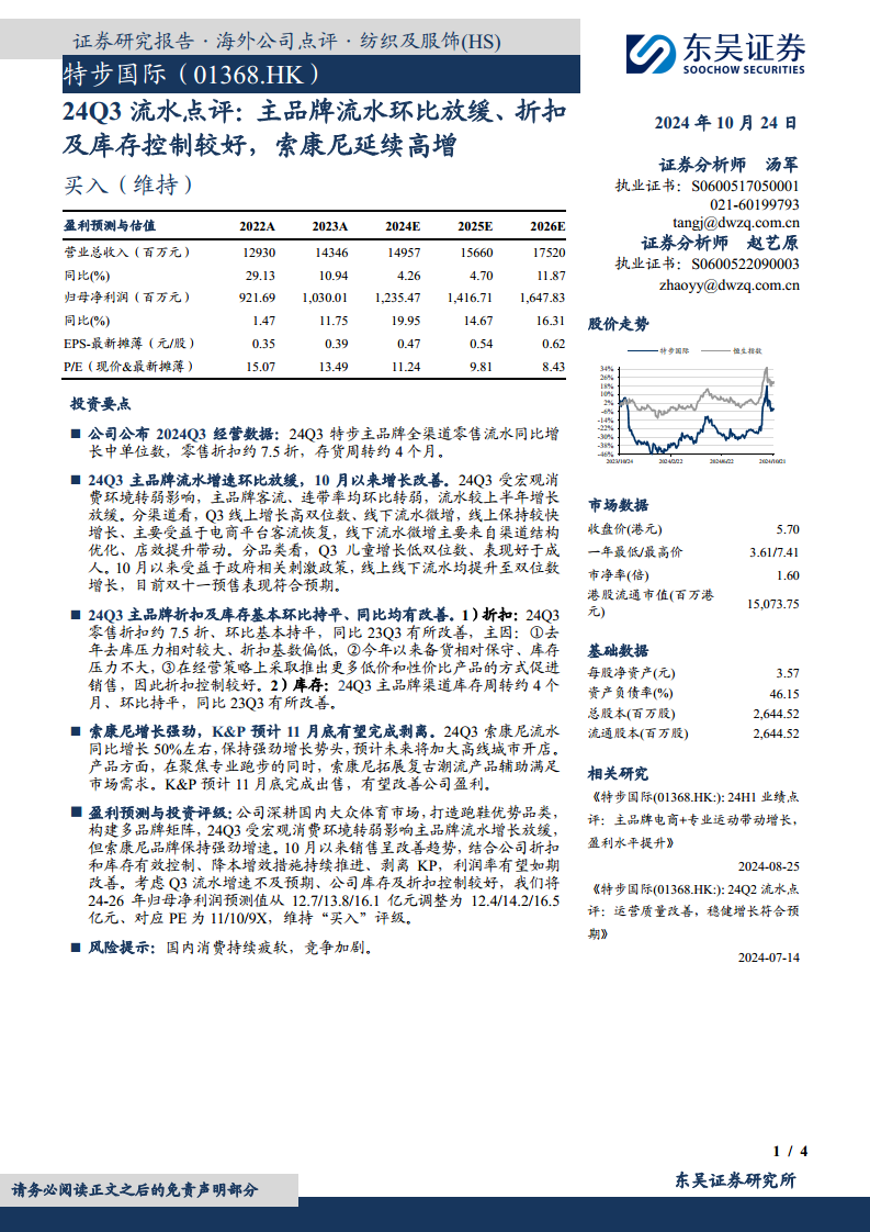 尽管短期内面临宏观消费环境的挑战,分析师维持对特步国际的“买入”评级。理由在于公司深耕国内大众体育市场,成功打造了跑鞋优势品类,并构建了多品牌矩阵。虽然24Q3主品牌流水增长放缓,但索康尼品牌保持强劲增速,且10月以来销售呈改善趋势。结合公司有效的折扣和库存控制、持续推进的降本增效措施以及K&P品牌的剥离,预计公司利润率有望如期改善,具备长期投资价值。