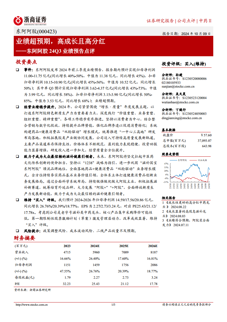 东阿阿胶24Q3业绩预告点评:业绩超预期,高成长且高分红