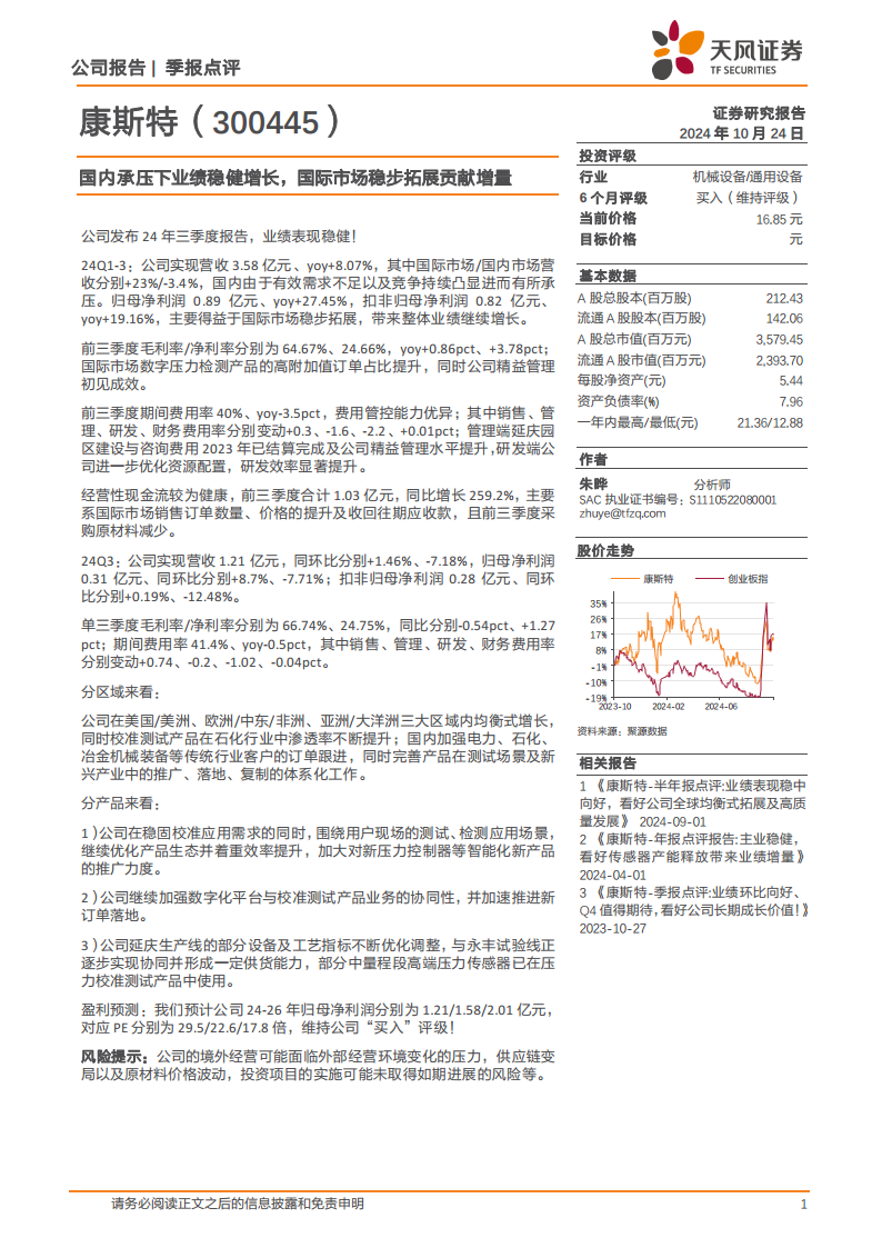 康斯特公司在2024年前三季度展现出稳健的业绩增长态势,营收和归母净利润分别同比增长8.07%和27.45%。国际市场是其主要增长引擎,营收同比增长23%,有效对冲了国内市场因需求不足和竞争加剧带来的压力。公司盈利能力显著提升,毛利率和净利率均有增长,同时通过精益管理和优化资源配置,期间费用率得到有效控制,经营性现金流大幅改善。在区域和产品策略上,公司实现了全球均衡增长,并持续优化产品生态、加强数字化协同及生产线建设。尽管面临境外经营环境变化、供应链波动和项目实施不确定性等风险,但基于其稳健的财务表现和市场拓展能力,分析师维持“买入”评级,并对未来盈利能力持乐观预期。