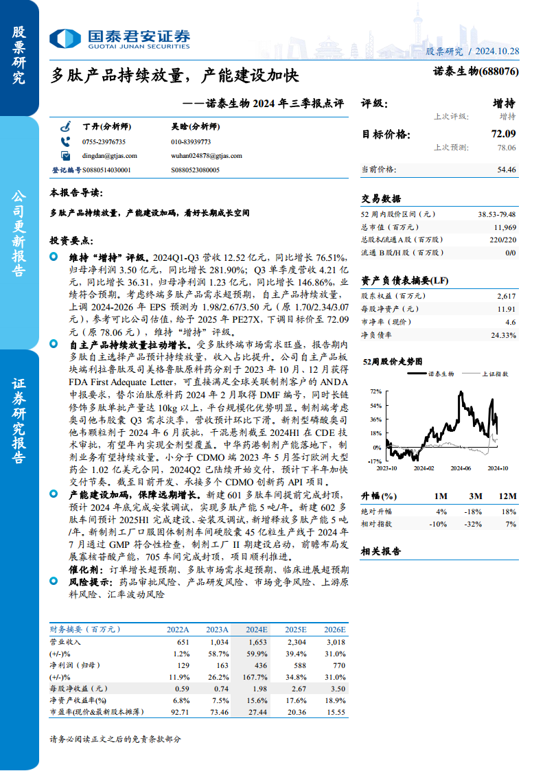 诺泰生物在2024年前三季度表现出卓越的业绩增长,主要得益于其自主多肽产品在市场需求旺盛背景下的持续放量,以及在关键多肽原料药领域取得的国际认证。公司积极推进多肽和制剂产能的建设与扩张,包括新建多肽车间、制剂工厂GMP认证及寡核苷酸产能布局,这些战略性举措为公司未来的持续增长奠定了坚实基础。尽管目标价有所调整,但分析师仍维持“增持”评级,反映了对公司长期发展潜力的认可。同时,报告也提示了药品审批、研发、市场竞争、原材料及汇率波动等潜在风险,建议投资者关注。