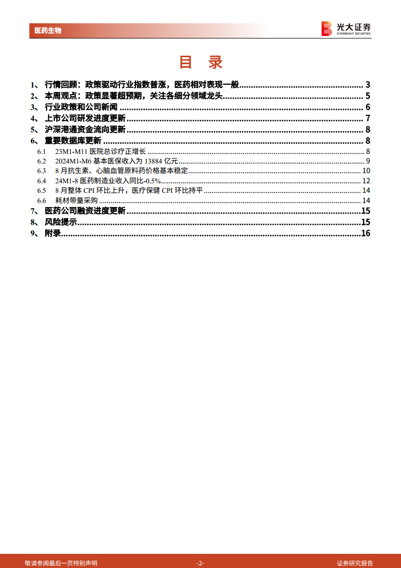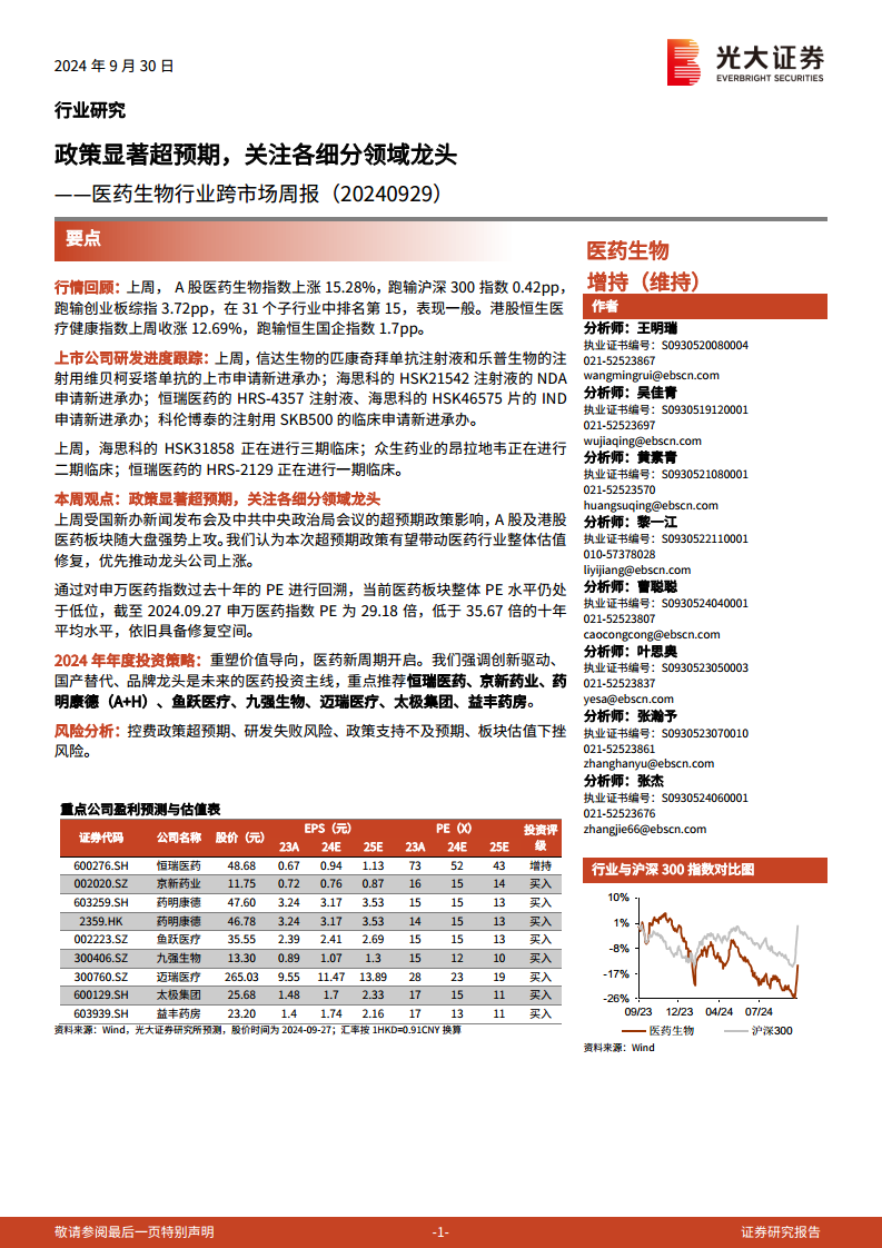 本报告核心观点指出,近期中国政府出台的超预期金融及经济支持政策,包括降准降息、创设证券市场支持工具以及强调财政货币政策逆周期调节等,对A股及港股医药生物板块产生了显著的积极影响。这些政策有望带动医药行业整体估值修复,尤其利好具备良好盈利能力和竞争力的龙头企业。