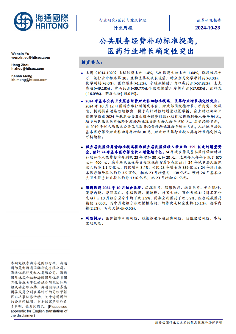 公共服务经费补助标准提高,医药行业增长确定性突出