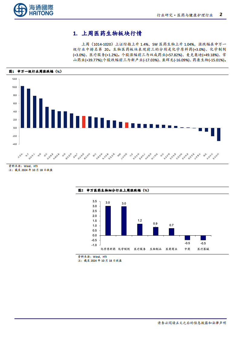 上周(10月14日至10月20日),A股市场整体上升,上证综指上涨1.4%。同期,申万医药生物指数上涨1.04%,在申万一级行业中排名第20位。在医药生物细分板块中,化学原料药和化学制剂均实现3.0%的涨幅,医疗服务板块上涨1.2%,位居涨幅前三。个股方面,双成药业、麦克奥迪和常山药业分别以57.82%、49.18%和39.77%的涨幅领跑,而新产业、亚辉龙和药康生物则出现较大跌幅。