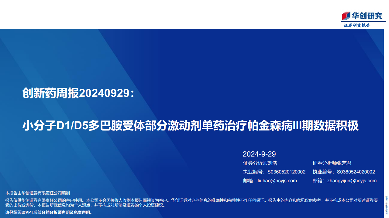 创新药周报:小分子D1/D5多巴胺受体部分激动剂单药治疗帕金森病III期数据积极