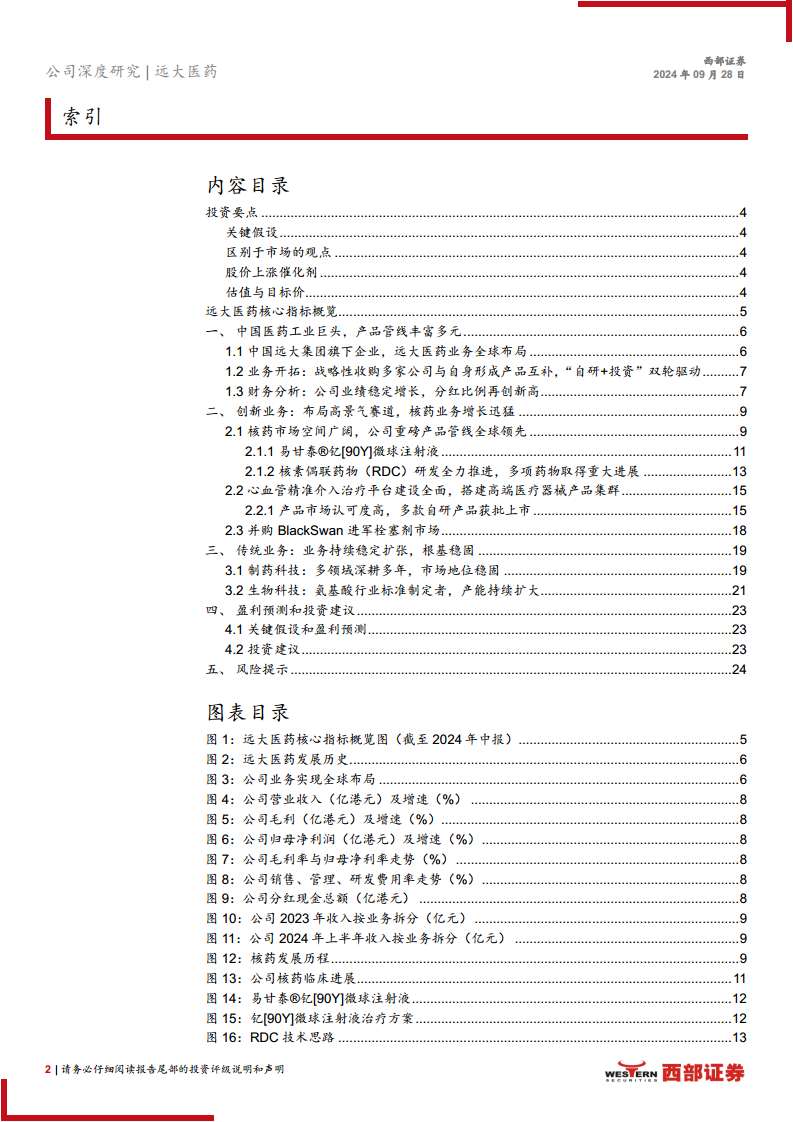 远大医药集团有限公司是一家科技创新型国际化医药企业,于2002年加入中国远大集团,并于2008年实现香港上市。公司核心业务涵盖制药科技、核药抗肿瘤诊疗及心脑血管精准介入诊疗科技、生物科技三大领域。公司在全球拥有超过一万名员工,境内外附属公司超过30家,并建立了5个技术平台和8个研发中心。其产品组合丰富,拥有超过200个医保目录产品,其中16个产品年销售额过亿港元。在核药抗肿瘤领域,远大医药的管线布局和商业化进程在国内处于领先地位,其产业链建设和全球化商业网络持续优化,合作伙伴遍布亚洲、美洲、欧洲及大洋洲等主要医疗市场,展现出强大的国际化运营能力。2023年,公司首次跻身中国医药工业百强系列榜单前二十名,进一步巩固了其行业地位。