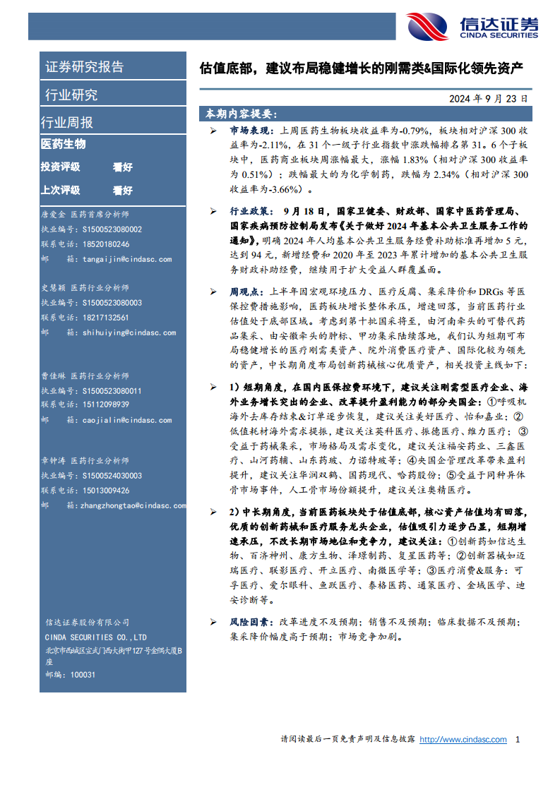 本周报对医药生物行业进行了深入分析,指出当前板块估值处于历史底部,为投资者提供了布局机会。报告详细阐述了短期内应关注医疗刚需、院外消费医疗及国际化领先资产,而中长期则应聚焦创新药械核心优质资产和医疗服务龙头企业。通过对市场表现、估值状况、细分行业走势以及最新政策和公司动态的全面梳理,本报告为投资者提供了专业且具分析性的市场洞察和投资策略建议,同时提示了相关风险。