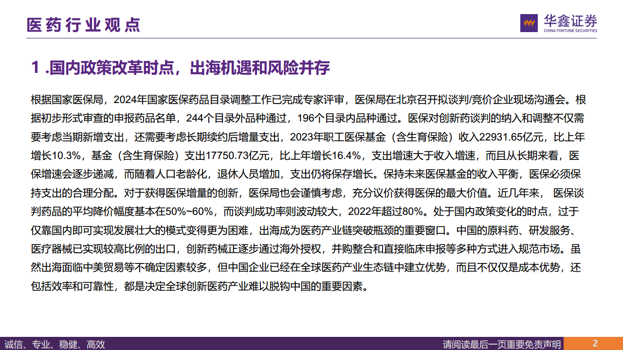 本报告核心观点指出,中国医药行业正处于国内政策改革的关键时期,医保基金支出增速高于收入增速,导致医保谈判对创新药的议价能力增强,平均降价幅度维持在50%~60%。在此背景下,仅依靠国内市场实现发展壮大变得日益困难,医药产业链“出海”成为突破瓶颈的重要战略窗口。中国企业在原料药、研发服务、医疗器械等领域已建立全球优势,创新药械正通过多种方式积极进入国际规范市场,尽管面临地缘政治不确定性,但其效率和可靠性使其在全球医药生态链中不可或缺。
