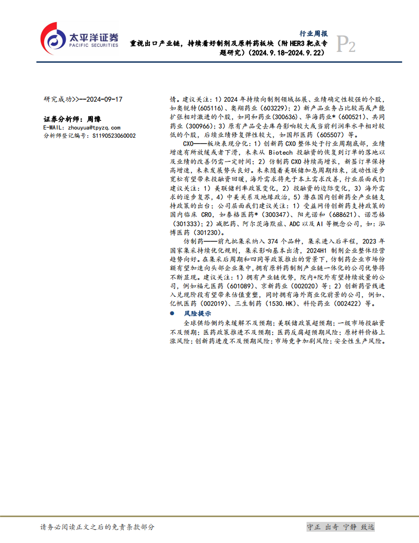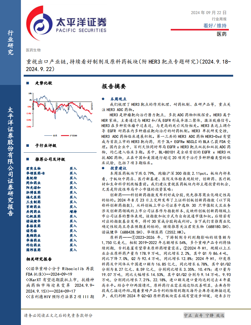 重视出口产业链,持续看好制剂及原料药板块(附HER3靶点专题研究)