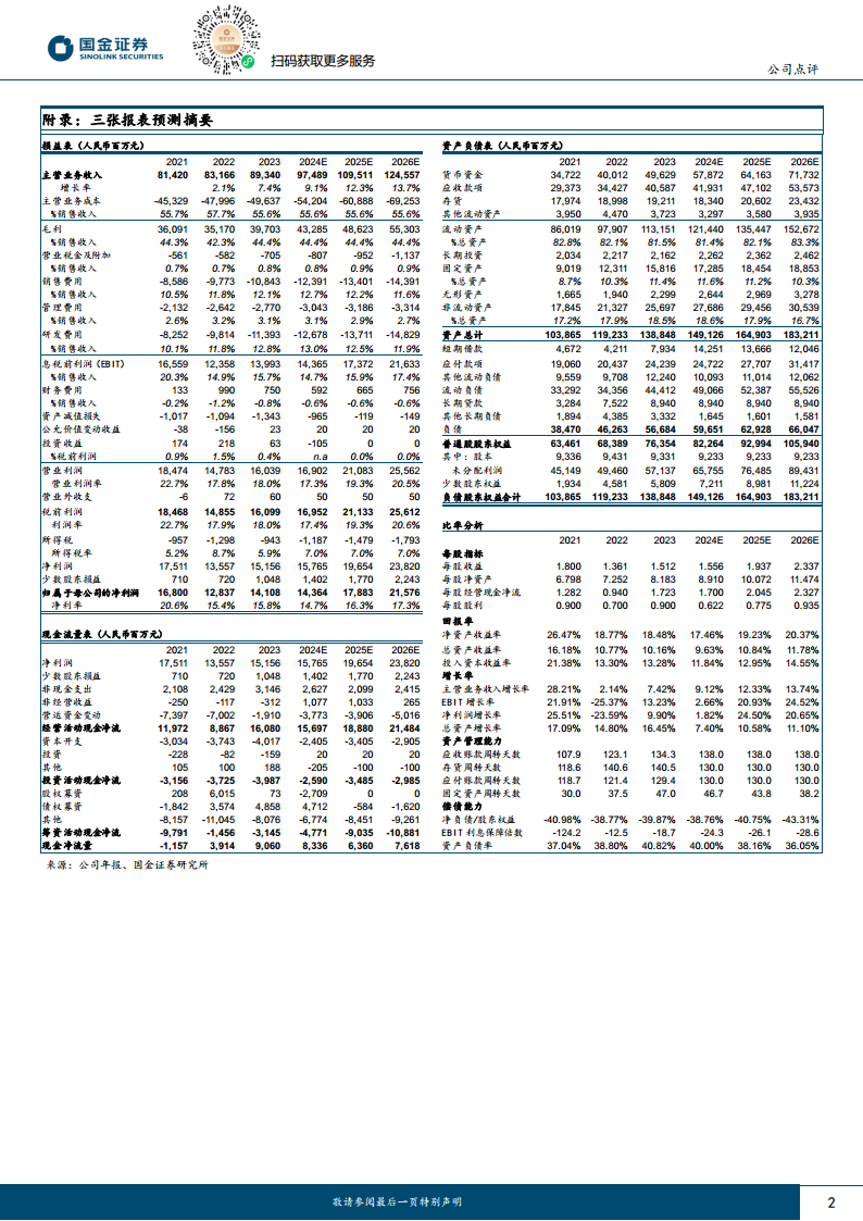 根据国金证券的盈利预测,公司2024年至2026年的营业收入预计分别为974.9亿元、1,095.1亿元和1,245.6亿元,归母净利润分别为143.6亿元、178.8亿元和215.8亿元,对应的每股收益(EPS)分别为1.56元、1.94元和2.34元。报告还提供了详细的损益表、资产负债表和现金流量表预测数据,以及多项比率分析,包括每股指标、回报率、增长率、资产管理能力和偿债能力。市场中相关报告的评级显示,在过去六个月内,市场对公司的投资建议以“买入”为主,平均评分接近1.00,反映了市场对公司未来表现的普遍乐观态度。
