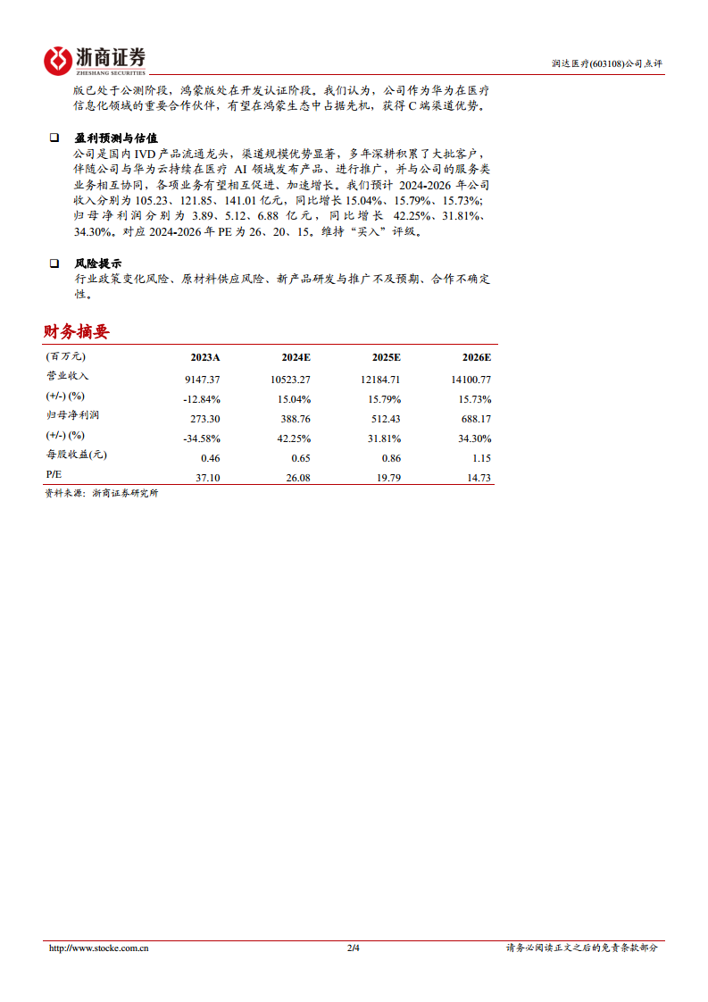 报告预计润达医疗2024-2026年将实现持续增长。预计2024年、2025年、2026年公司营业收入分别为105.23亿元、121.85亿元、141.01亿元,同比增长15.04%、15.79%、15.73%。归母净利润分别为3.89亿元、5.12亿元、6.88亿元,同比增长42.25%、31.81%、34.30%。对应2024-2026年PE分别为26倍、20倍、15倍。鉴于公司作为国内IVD产品流通龙头,渠道规模优势显著,且与华为云在医疗AI领域的持续合作及产品推广将与公司服务类业务相互协同,各项业务有望相互促进、加速增长,报告维持“买入”评级。