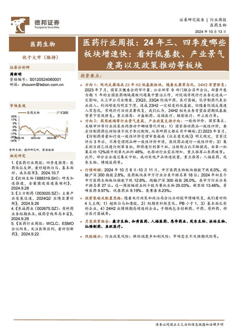医药行业周报:24年三、四季度哪些板块增速快:看好低基数、产业景气度高以及政策推动等板块