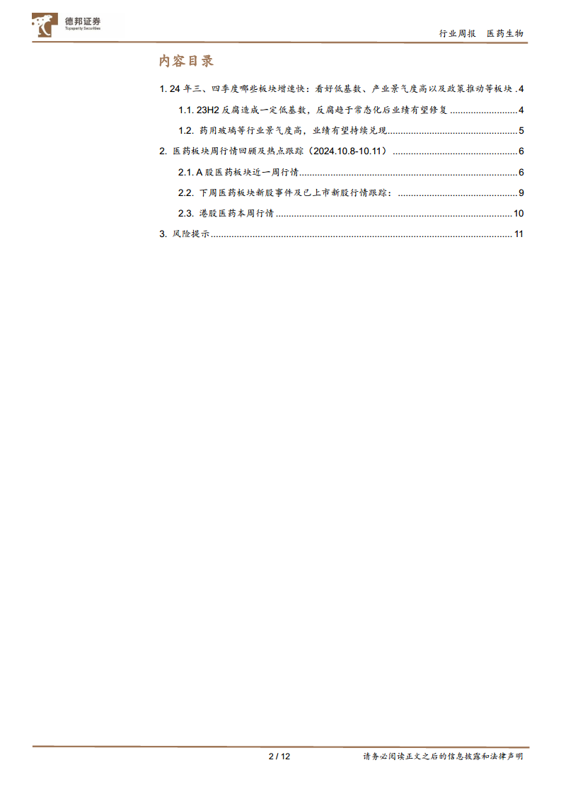 本周报深入分析了医药生物行业在2024年三、四季度可能实现快速增长的驱动因素和市场表现。核心观点在于,2023年下半年因医药反腐导致的低基数效应,有望在反腐常态化后促使院内业务相关板块在2024年下半年实现业绩修复。同时,药用玻璃等细分领域在国家一致性评价、集采和关联审评等政策的持续推动下,展现出高景气度和稳定的竞争格局,预计将持续贡献业绩增长。