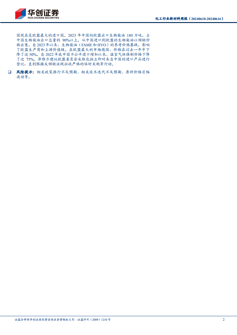 报告提示了多项风险,包括相关政策推行不及预期(如禁塑令、国六政策、双碳政策)、相关技术迭代不及预期(如合成生物、可降解塑料、再生塑料)、化工行业安全事故影响开工以及原料价格(如煤、石油、天然气)巨幅波动导致成本波动等。