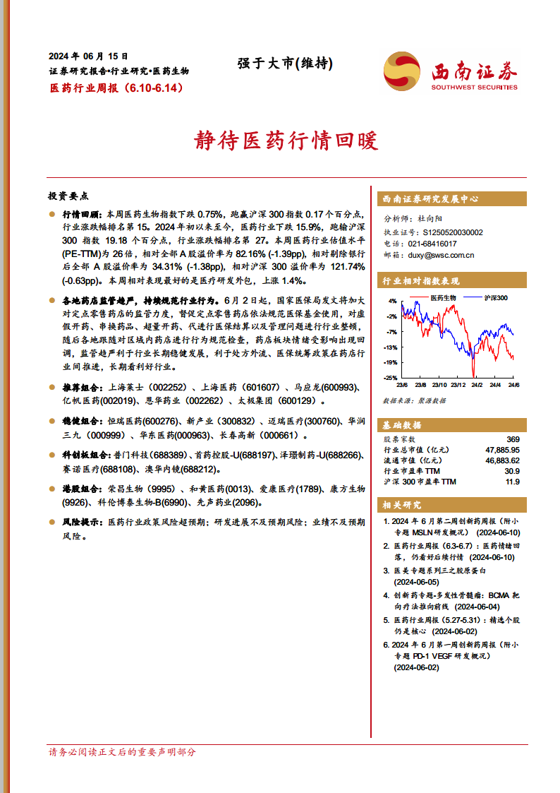 本周(2024年6月10日至6月14日),医药生物指数下跌0.75%,表现优于沪深300指数0.17个百分点,在行业涨跌幅榜中位列第15。然而,自2024年初至今,医药行业累计下跌15.96%,跑输沪深300指数19.18个百分点,行业涨跌幅排名第27,显示出医药板块在今年以来的整体弱势。