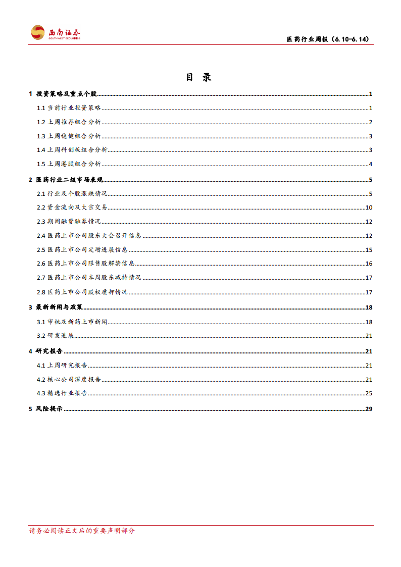 西南证券持续提供全面的行业及公司研究报告,为投资者提供深入的市场分析和投资建议。投资者在把握医药板块结构性机会的同时,需警惕医药行业政策风险超预期、研发进展不及预期以及业绩不及预期等潜在风险。