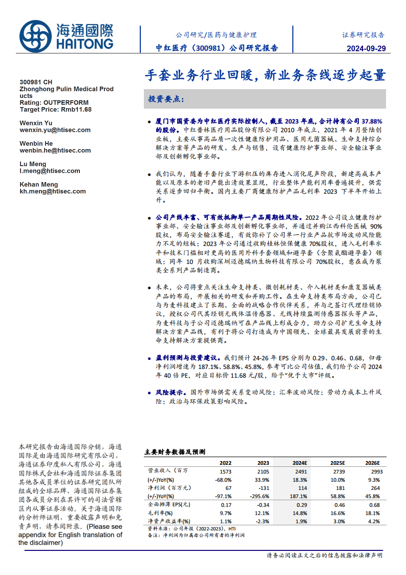 报告预计中红医疗2024-2026年EPS分别为0.29、0.46、0.68元,归母净利润增速分别为187.1%、58.8%、45.8%。基于可比公司估值,报告给予公司2024年40倍PE,对应目标价11.68元/股,并维持“优于大市”评级。盈利预测主要基于以下假设:防护类产品(手套及安全套)未来几年增速平稳,其中安全套因基数低和毛利率高将贡献主要增速;输注类产品在2023年并购基数上保持平稳发展;创新孵化产品(输注泵等高值耗材)作为公司重点战略发展项目,未来三年将持续保持高速增长。