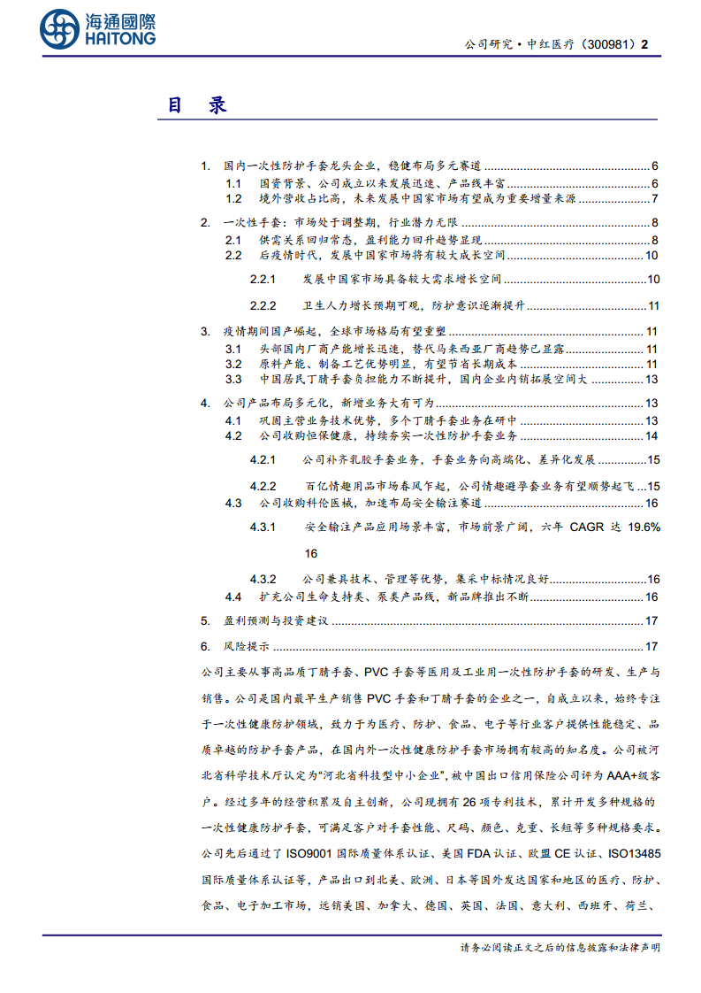 中红医疗正处于一个关键的战略转型期,通过一系列前瞻性的并购和多元化业务布局,成功从单一防护手套制造商转型为涵盖健康防护、安全输注和生命支持解决方案的综合性医疗器械企业。在全球一次性手套市场回暖、发展中国家需求潜力巨大的背景下,公司凭借其国资背景、丰富的产品线、技术优势以及成本控制能力,有望在全球市场格局重塑中占据有利地位。同时,在安全输注和生命支持等新兴高增长赛道的积极拓展,将为公司带来新的增长动力和更高的盈利空间。尽管面临国外市场供需变动、汇率波动等风险,但公司多元化的产品组合和持续的创新投入,使其具备较强的抗风险能力和长期增长潜力,因此获得“优于大市”的投资评级。